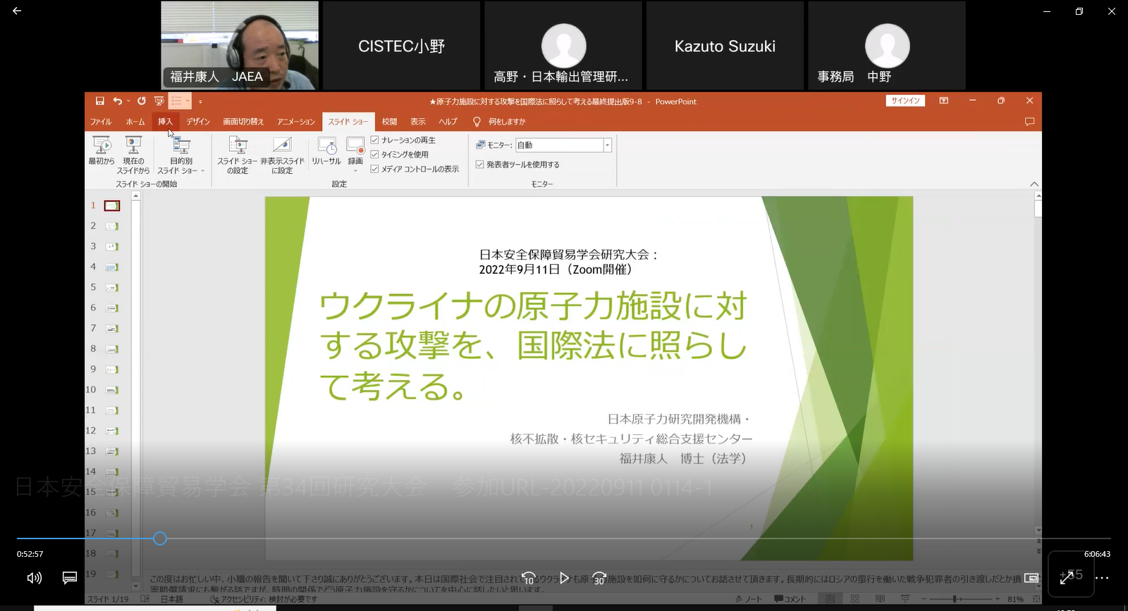 福井 康人氏から「原子力施設に対する攻撃を如何に法的に守るか:ウクライナの教訓を踏まえて」のテーマで報告があった。