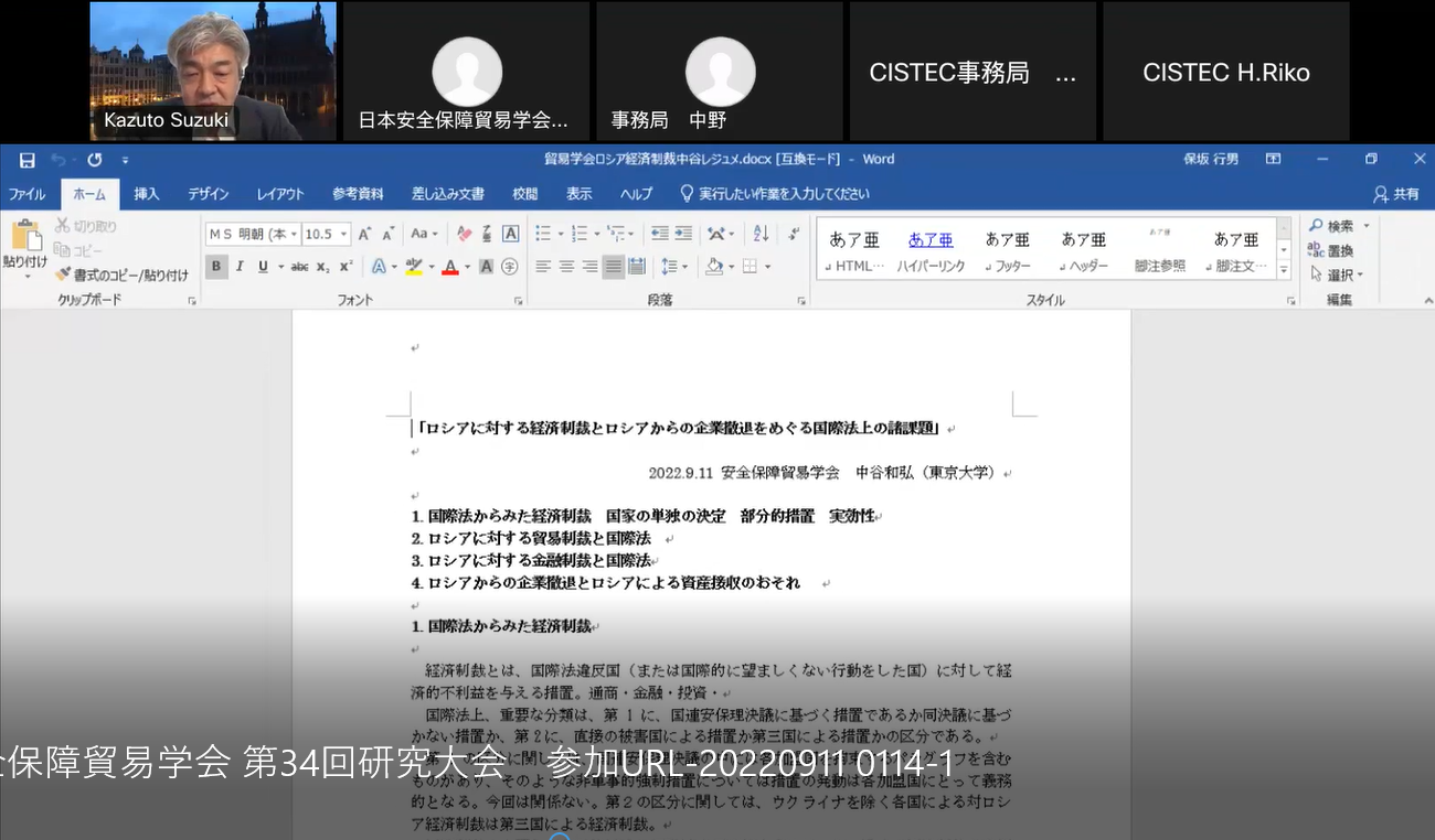 - (1) 中谷 和弘氏より「ロシアに対する経済制裁とロシアからの企業撤退をめぐる国際法上の諸課題」について報告があった。