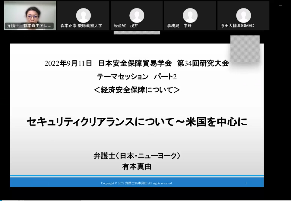 第34回日本安全保障貿易学会研究大会は、新型コロナウイルスの影響で2022年9月11日(日)にOnlineにて86名の参加者を得て開催された。午前の自由論題セッションは1名の方から、午後のテーマセッションは2セッションを設け報告があった。