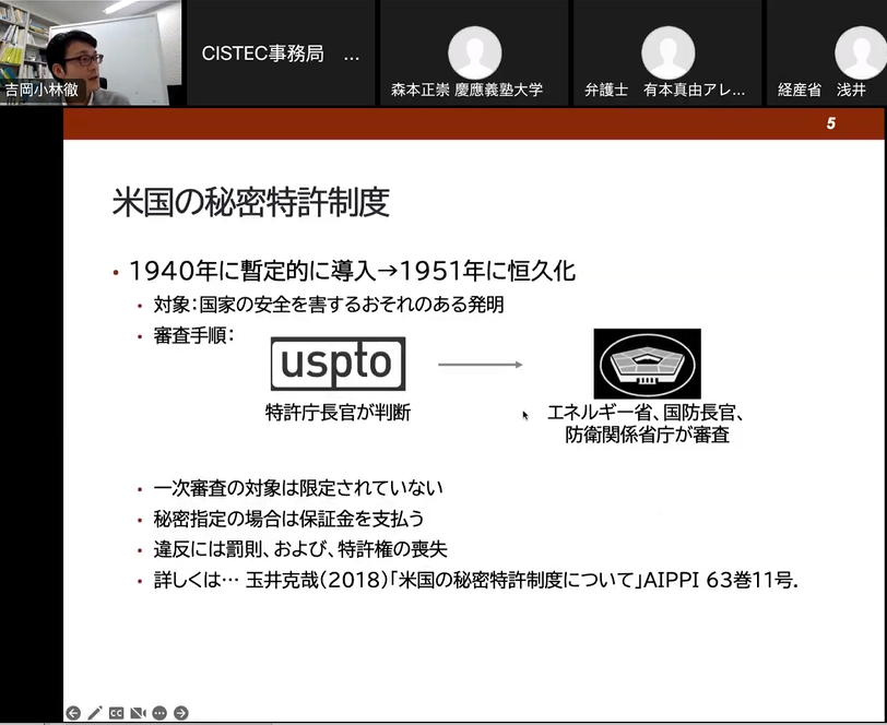 日本では今年5月に公布され、「公にすることにより国家及び国民の安全を損なう事態を生ずるおそれが大きい発明」が指定される。先行している米国の例を分析した。非軍需企業においては、技術分野の発展を阻害している傾向がある。一方、軍需産業への影響は限定的である。また、経済安全保障への効果としては仮に他国と競合関係にある場合は、かえって自国の不利を招き得るとした。一方、秘密特許は日本での対応の影響はほぼないものの、機微技術に関する出願を事前に避ける(=安全保障貿易管理を適切に行う)ことは重要とした。